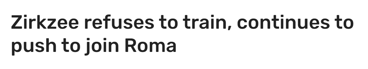 《米兰体育报》报道称:「齐尔克泽的转会希望仍未完全破灭,埃文·弗格森的离队是齐尔克泽加盟罗马的必要前提,凯尔特人有意引进弗格森。昨天这位荷兰人并未现身曼联的训练场,而且也没有医疗报告能解释他的缺席。实际上,当红魔在训场上备战时,这位前博洛尼亚球员却在罗马的社媒帖子下点赞并附上了一个爱心表情。这些信号足以说明问题,足够表明齐尔克泽渴望加盟加斯佩里尼的罗马队。」