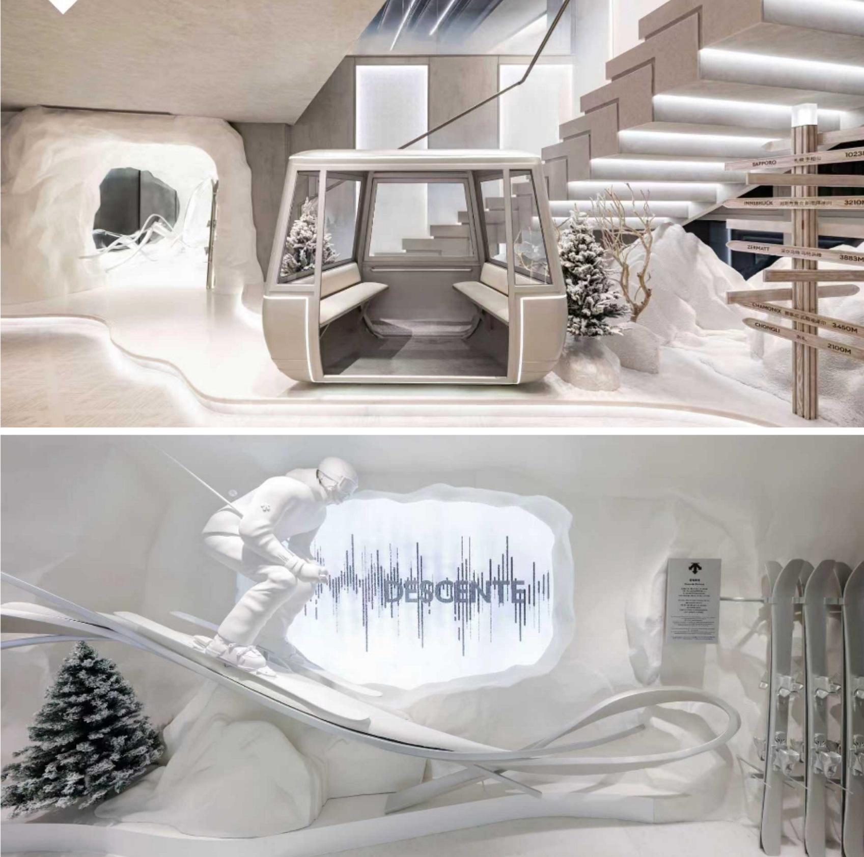 高端专业运动品牌DESCENTE迪桑特于北京华贸中心呈现"问顶未来"品牌大秀,并为其全球旗舰店"未来之城"举行启幕仪式。品牌大秀以迪桑特北京华贸全球旗舰店——"未来之城"为叙事起点,"未来之城"的设计核心源自无限向前的概念——莫比乌斯环,空间以此为母体,结合品牌基因化作无限延展的雪道,营造出周行不息的视觉体验。大秀外场以"未来雪域"为灵感,围绕滑手破雪的雪浪意象,打造出冰晶光束与金属结构交织的光影装置。