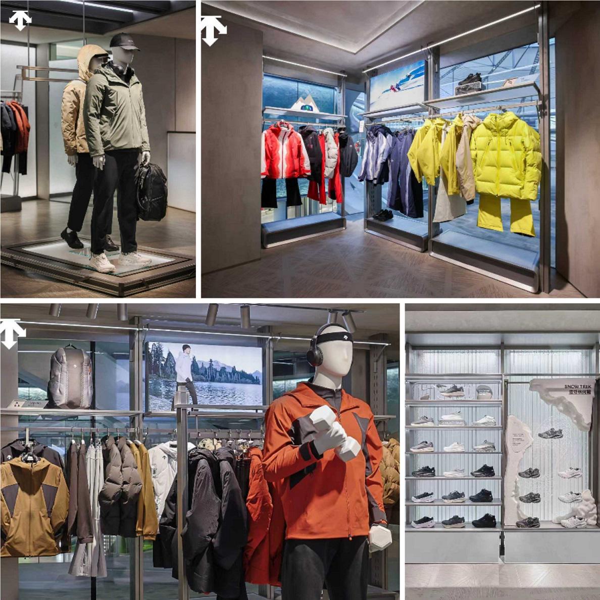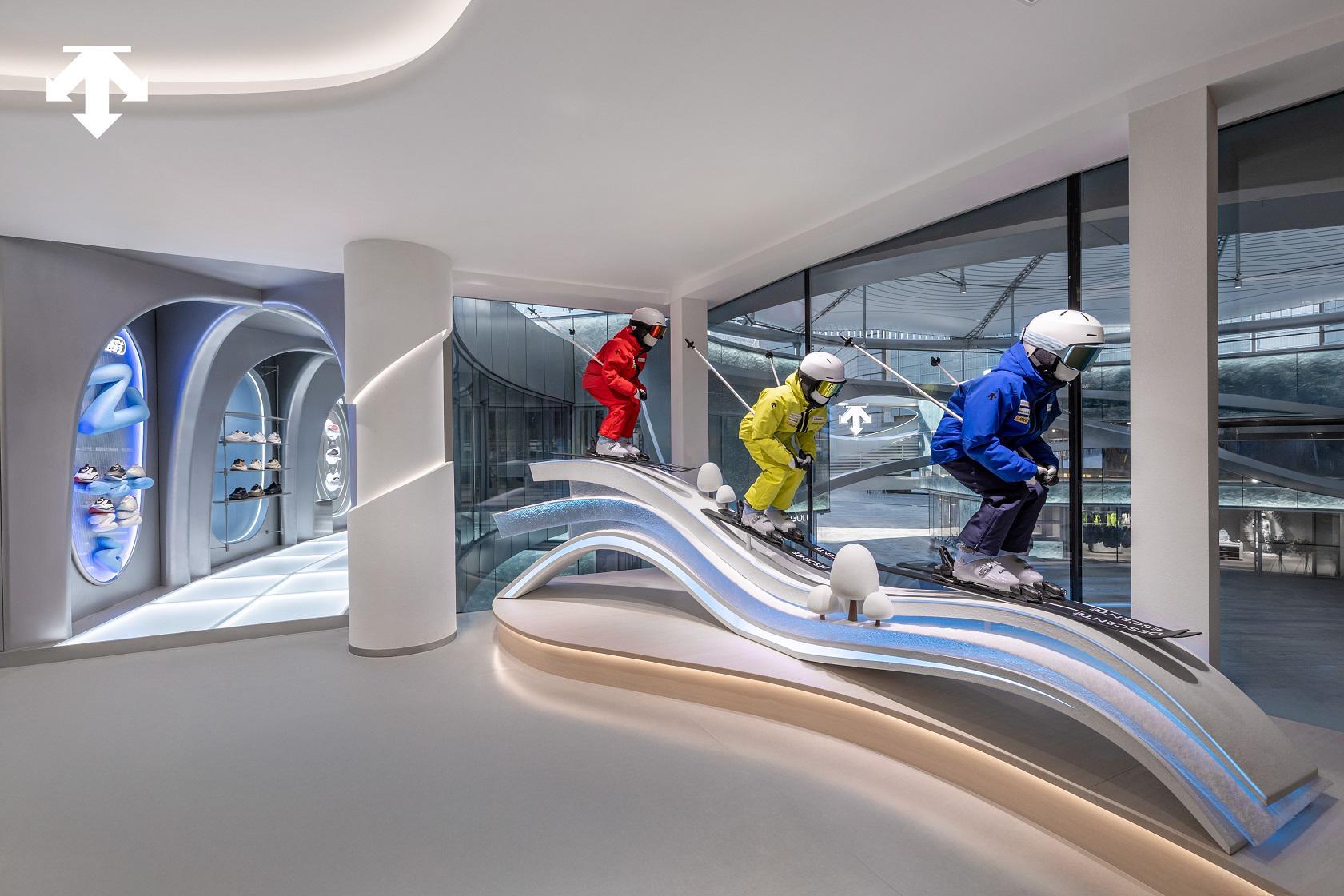 光芒循着建筑内在的莫比乌斯环轨迹缓缓蔓延,依次点亮高尔夫、BLANC、全品类专精及儿童四大主题空间,旗舰店的幕布同步徐徐开启,"未来之城"以完整姿态亮相。这座精心打造的空间巧妙融合冰雪文化构想、创新零售陈列方式与未来科技元素,从主题分区的功能规划到沉浸式场景的营造,每一处细节都凝聚着品牌对专业运动体验的创新探索。