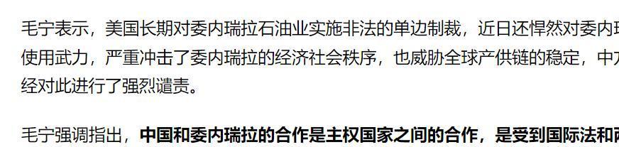 毛宁强调,中国和委内瑞拉的合作是两个主权国家的正常合作,受法律保护。