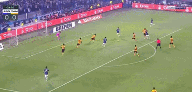 阿尔马达右路低传门前,赞比亚后卫钱达伸脚拦截,却不慎将球踢入自家大门,阿根廷4-0!